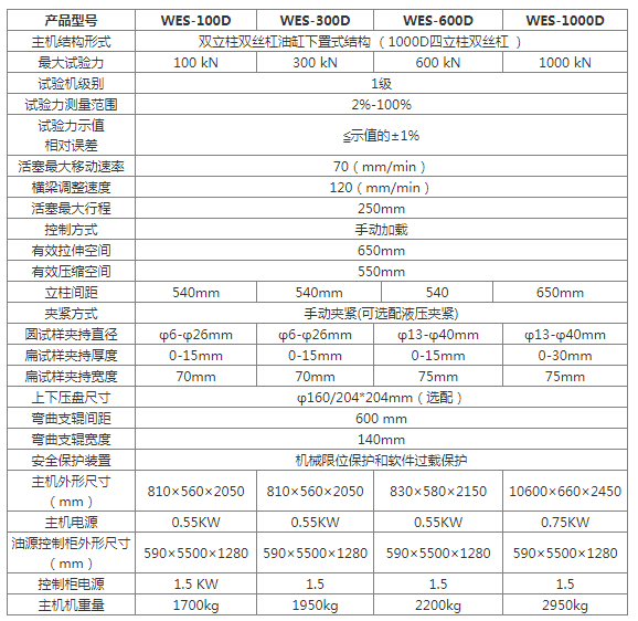 主要用途 濟南試金WES-D數(shù)顯式液壓萬能試驗機主要用于金屬材料的拉伸、壓縮、彎曲等力學(xué)性能試驗,增加簡單的附件后可對水泥、混凝土、磚、瓦、橡膠及其制品進行檢測。本機由雙立柱雙絲杠油缸下置式主機及琴式油源控制柜組成。拉伸空間位于主機上方,壓縮、彎曲試驗位于主機下方即中橫梁和工作臺之間。試驗空間的調(diào)整