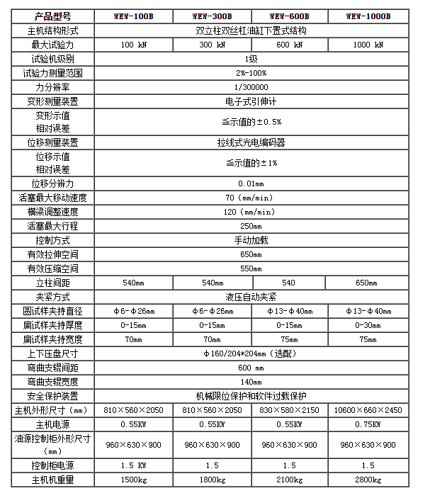 濟南試金WEW-B系列微機屏顯式液壓萬能試驗機主要用于金屬材料的拉伸、壓縮、彎曲等力學(xué)性能試驗,增加簡單的附件后可對水泥、混凝土、磚、瓦、橡膠及其制品進行檢測。