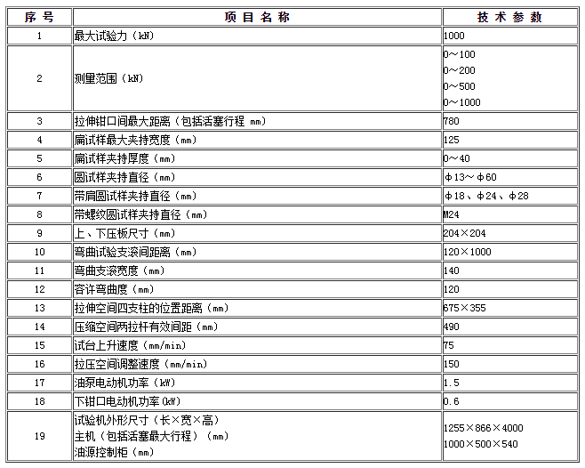 ●WE-1000A型液壓式萬(wàn)能試驗(yàn)機(jī)主要技術(shù)規(guī)格及參數(shù):